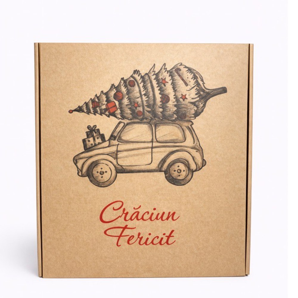 Cutii din carton 320X275X100 TK-22 Е craft cu imprimare ‘Masina de craciun ’ – alegerea perfectă pentru ambalarea cadourilor de Craciun si Anul Nou. Designul elegant cu inscripția ‘Craciun Fericit’ va conferi cadoului dumneavoastră un aspect special, iar cartonul ondulat de calitate va asigura o protecție sigură a conținutului. Cutiile sunt rezistente, ecologice și ușor de asamblat.